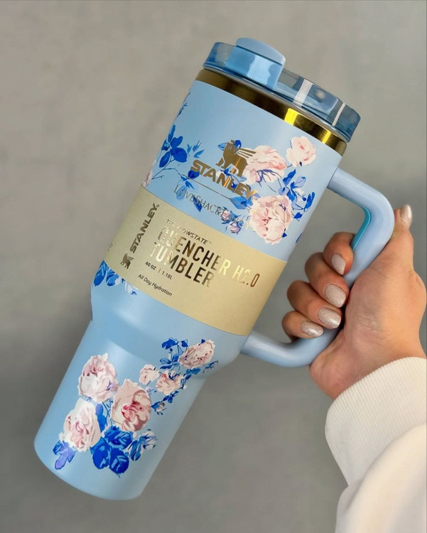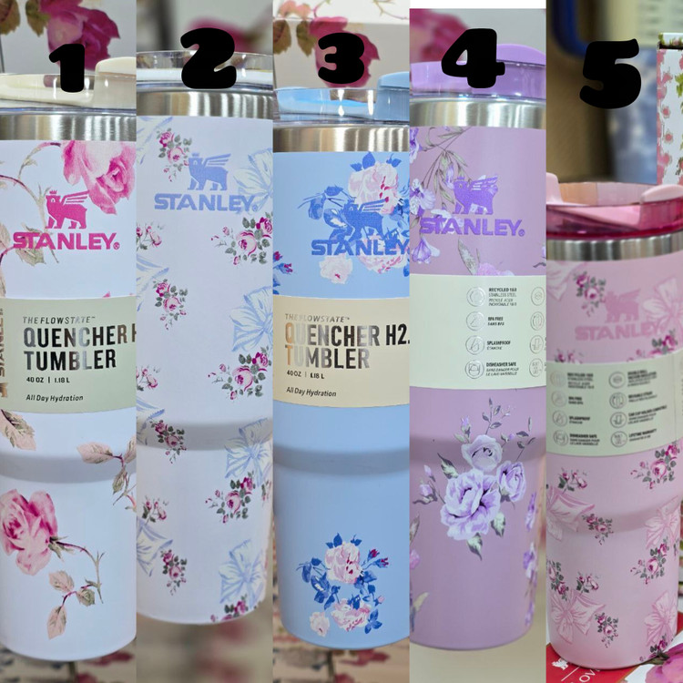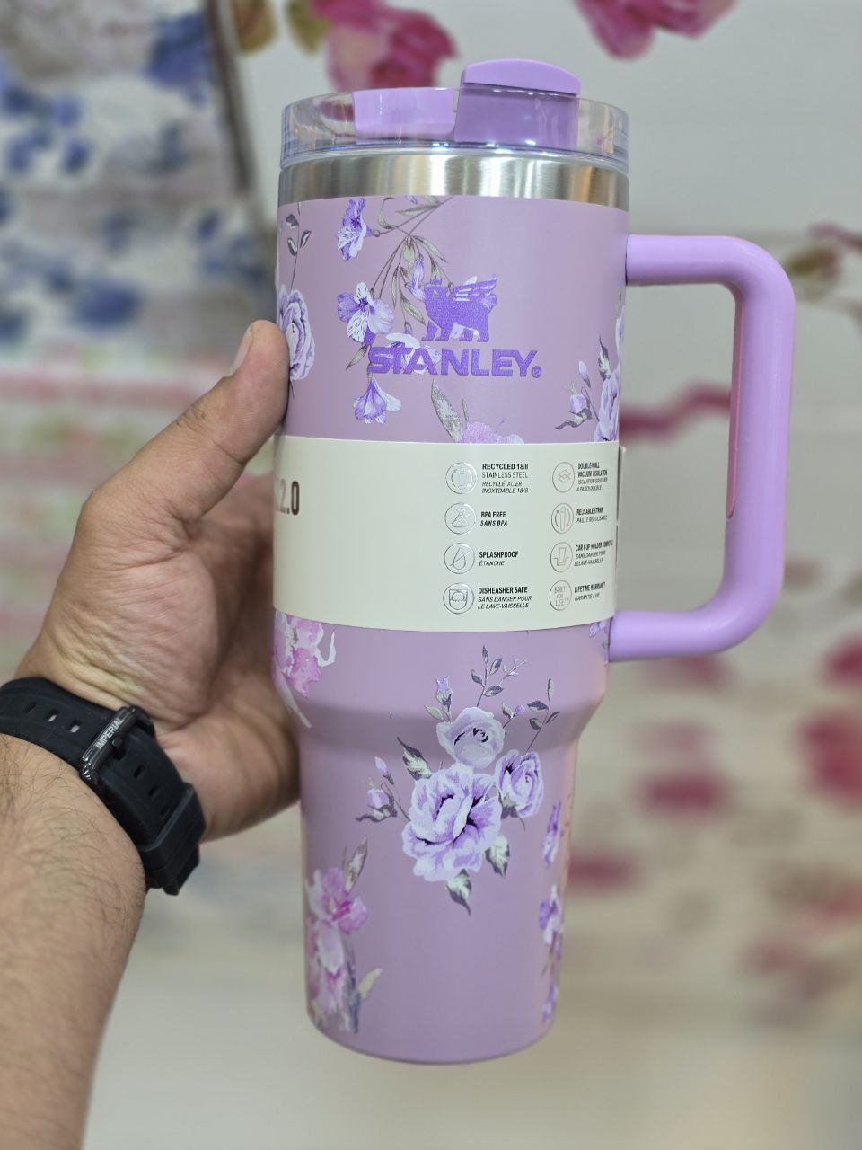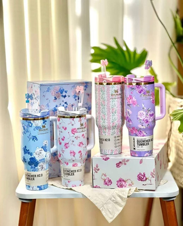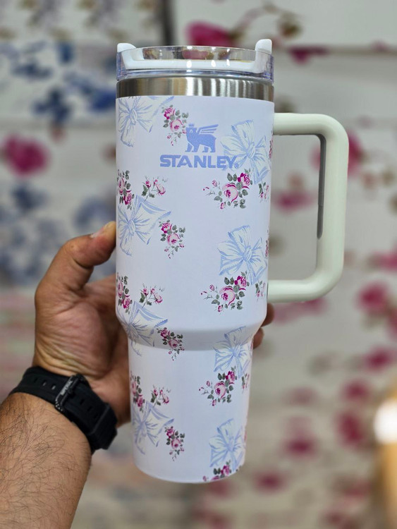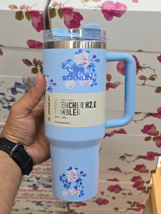 تامبلر استنلی طرح گل در چهار رنگ جذاب عرضه میشود تا بتوانید رنگ مورد علاقه خود را انتخاب کنید. رنگهای آبی، صورتی، یاسی و سفید، هر کدام جلوهای خاص به این محصول بخشیدهاند.