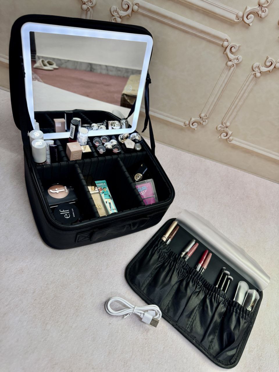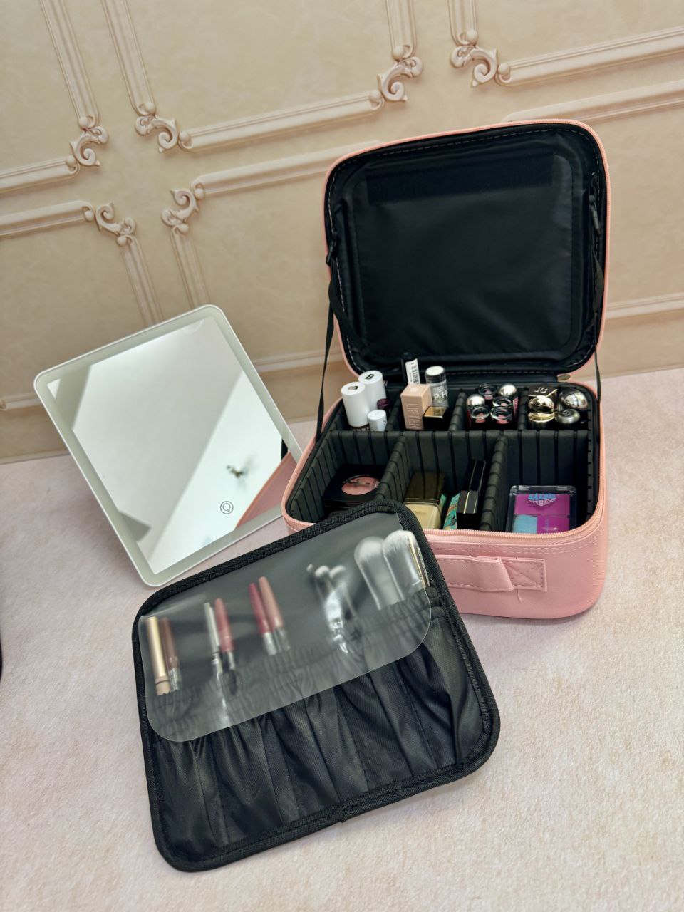 باکس لوازم آرایش +نظم دهنده قابل تغییر + آینه led دار شارژی ، هدیه زنانه ،