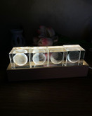 این چراغ خواب از جذاب از یک پایه چوبی به طول 19 و عرض 5 سانتی متر ساخته شده است. که درون آن یک نوار ال ای دی قرار دارد. قسمت اصلی ماجرا مکعبهای کریستالی با ابعاد 4 سانتی متری قرار دارند. که درون هر کدام از این مکعبها مرحله ای از ماه در آسمان شب مشخص است. همانطور که میدانید ماه همیشه به صورت کامل و یا نیمه جلوه نمی کند و یک سیر دارد که حدود 29 روز طول میکشد. ماه در شب 14م به کاملترین حالت خود می رسد که به ماه بدر یا ماه کامل معروف است.