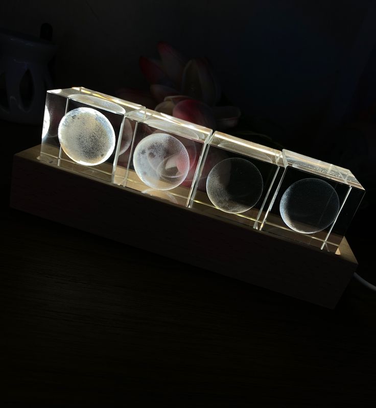 این چراغ خواب از جذاب از یک پایه چوبی به طول 19 و عرض 5 سانتی متر ساخته شده است. که درون آن یک نوار ال ای دی قرار دارد. قسمت اصلی ماجرا مکعبهای کریستالی با ابعاد 4 سانتی متری قرار دارند. که درون هر کدام از این مکعبها مرحله ای از ماه در آسمان شب مشخص است. همانطور که میدانید ماه همیشه به صورت کامل و یا نیمه جلوه نمی کند و یک سیر دارد که حدود 29 روز طول میکشد. ماه در شب 14م به کاملترین حالت خود می رسد که به ماه بدر یا ماه کامل معروف است.